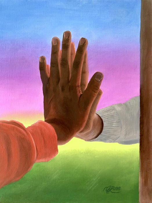This painting was the result of time spent reflecting on the last few months. These are difficult times for all of us. I found a reference photo on Pixabay and changed it up by changing the background and the skin color of one of the hands. In the reference photo, they were both dark skinned. There should never be an issue regarding skin color. We’re all people trying to make it in this world. Someone looked at this painting and saw the colors of the rainbow in the background representing the GLBT. That pleases me because that’s a happy accident 😊