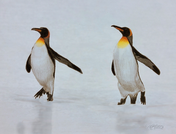 Two penguins doing the Hokey Pokey dance, done in colored pencil on gray toned archival paper